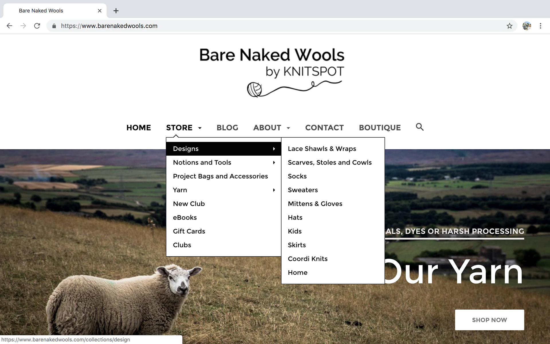 Since the names of the yarns are unique and not named after the breeds from which they're made, I wanted a page that showed all the yarns lines, as well as the dropdown menu.